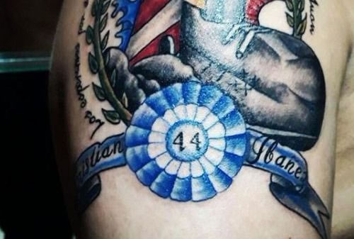 El tatuaje le ocupa casi un cuarto de su espalda, y puede verse al submarino en superficie, rodeado de laureles, y una leyenda que hace referencia a la Armada Argentina y a los 44 tripulantes.